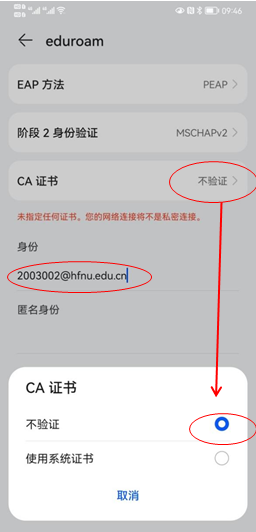 我校师生在联盟高校或机构访问时,搜索到eduroam无线环境后,通过wifi连接认证后即可访问互联网,上网账号为:学号或工号@hfnu.edu.cn,密码为:校园网认证密码(请妥善保管,切勿外传)。如下图设置: