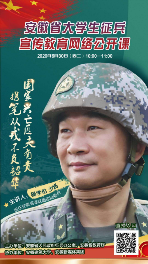 为鼓励更多大学生参军入伍,省征兵办、省教育厅结合“征兵宣传月”活动,组织“全省大学生征兵宣传教育网络公开课”现场直播和网络展播。根据安徽省人民政府征兵办公室、安徽省教育厅《关于组织“全省大学生征兵宣传教育网络公开课”的通知》(皖征〔2020〕23号)精神,现将有关事项通知如下:
