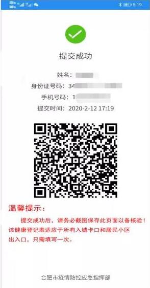 所有经由公路、铁路、航空、水路等方式的返(来)肥人员,进入本市时应主动接受体温检测,如实填写《健康登记表》。为提高通行效率,减少排队等待时间,请近期即将返(来)肥人员,在出发前或途中,提前通过手机网络填报个人健康登记信息(操作说明附后),并保留提交成功后的二维码截图,以备防控人员查验。