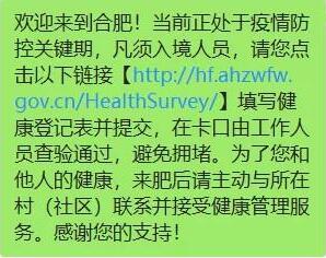 1、人员进入合肥市域后,收到通信运营商短信,提醒进行健康登记,点击链接地址进行登记