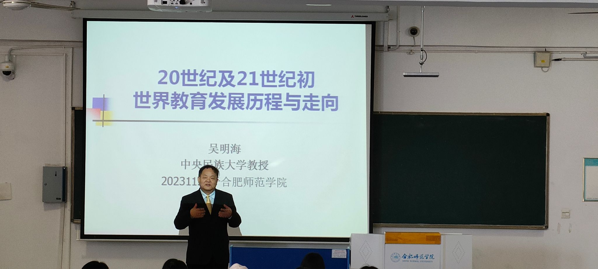 在锦绣校区逸夫楼303教室,吴明海作了题为《二十世纪及二十一世纪初世界教育发展的历程与走向》的学术报告。报告由教育与心理科学学院副院长胡连峰主持,校友办负责同志及教育与心理科学学院120余名学生聆听了报告。报告中,吴明海首先介绍了20世纪至21世纪初的时代背景,指出这是人类社会一个大动荡、大发展、大飞跃的时代,在这个历史时期世界教育发生了深刻变化,先后出现了教育民主化、教育科学化、教育终身化、教育全球化、教育信息化等五个教育浪潮,回顾与研究这个历史时期的世界教育发展史,不仅有利于传承文化,也有利于展望未来,推测21世纪教育的走向,从而继往开来。接着他从产生背景、标志、主要内容以及由此产生的教育教学改革情况等诸多方面,对每一个教育浪潮进行了系统梳理与深入阐释。最后提出如果上述五个浪潮是从各时间点出发的奔马,那么我们现在的时代,就是五马并驱;如果五个教育运动是在不同时间段出现的新星,那么我们现在就是五星联袂。五星联袂、五马并驱便是21世纪教育未来的发展方向。报告临近结束时,吴明海与学生进行了互动,回答了学生提出的相关问题。整场报告内容丰富,视野开阔,逻辑严谨,重点突出,观点鲜明,使同学们获益匪浅,受到了大家的好评。(发展规划处(校友办)、教育与心理科学学院)