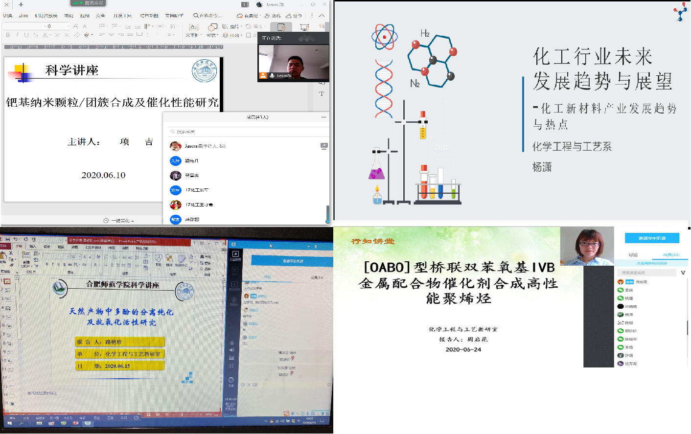 本网讯 在常态化疫情防控期间,为确保化学工程与工艺专业“化工学科前沿讲座”课程顺利推进,帮助不能返校学习的同学们吸收专业“学术营养”,近日,化学与化学工程学院组织化工专业骨干教师项吉、路艳珍、杨潇、周启花四位老师利用腾讯会议平台开展学术讲座,他们分别以“钯基纳米颗粒/团簇合成及催化性能研究”、“苹果多酚的分离纯化及抗氧化活性研究”、“化工新材料产业发展趋势与热点”、“[OABO]型桥联双苯氧基IVB金属配合物催化剂合成高性能聚烯烃”为主题开展线上学术讲座。