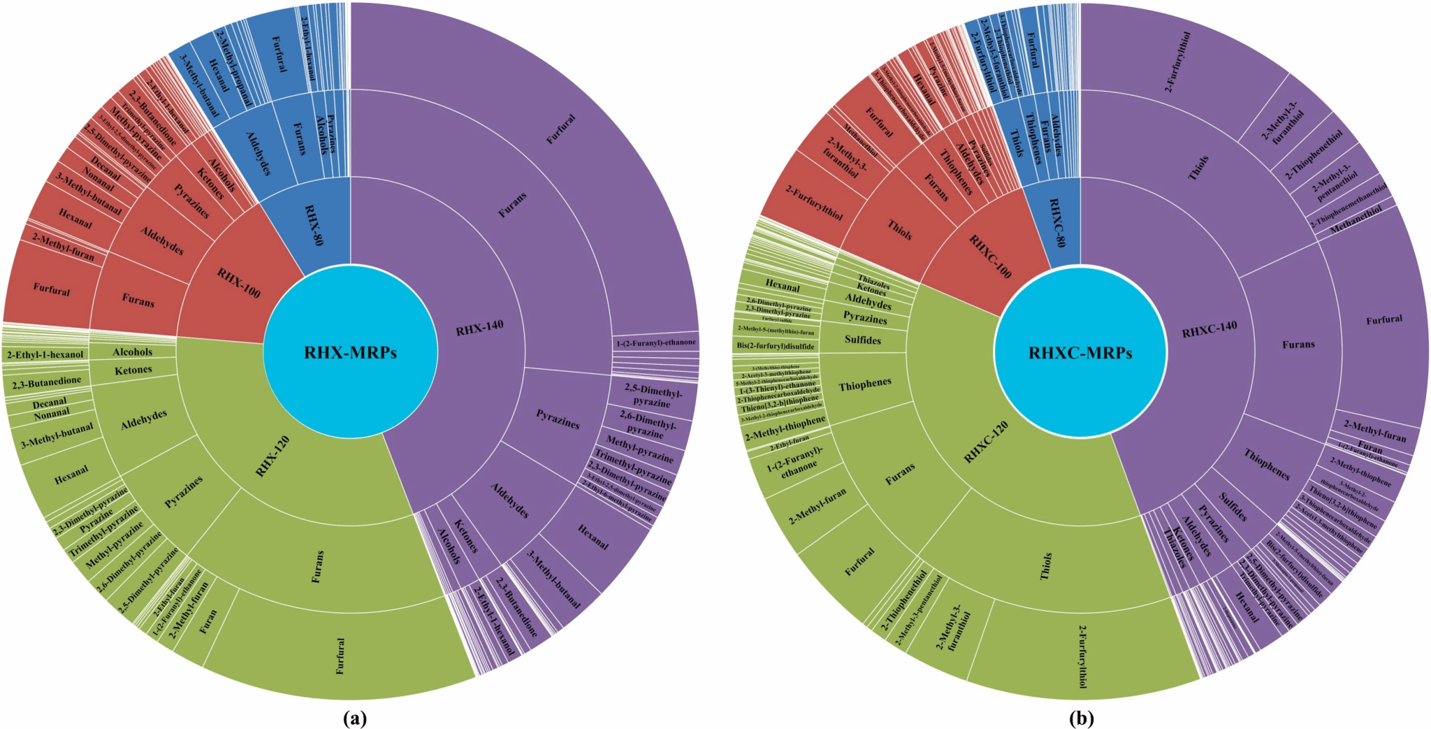 团队通过建立大米分离蛋白水解物-木糖的美拉德反应体系,通过调控温度和半胱氨酸来开发一种潜在的肉类风味剂。研究了温度和半胱氨酸添加对产物的理化性质、抗氧化活性和风味特性(游离氨基酸、挥发性化合物、气味特征、味道特征和整体感官属性)的综合影响。结果表明,温度和半胱氨酸是美拉德反应中影响肉味形成的重要加工变量。升高温度会加深产物颜色,促进挥发性化合物的形成,并降低整体鲜味和苦味。半胱氨酸添加有助于抑制产物褐变、增强抗氧化性、改善口感、减少苦味以及形成肉味化合物(含硫呋喃、噻吩、噻唑、硫醇和硫化物)。在120℃下添加半胱氨酸制备的产物具有突出的抗氧化活性和相对较高的口感、鲜味、肉香和相对较低的苦味,未来有望开发作为潜在肉类风味剂。