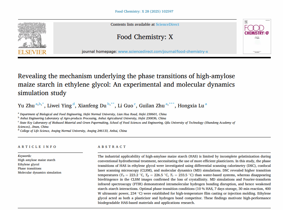近日,生物与食品工程学院朱玉博士、朱桂兰教授团队联合安徽农业大学、齐鲁工业大学(山东省科学院),在以beat365唯一官方网站为第一单位的研究中取得重要进展。相关研究成果《Revealing the mechanism underlying the phase transitions of high-amylosemaize starch in ethylene glycol: An experimental and molecular dynamicssimulation study》发表在食品与材料科学交叉领域国际权威期刊《Food Chemistry: X》(中科院一区Top期刊)。该研究通过实验与分子动力学模拟,首次系统阐明了乙二醇作为高效塑化剂诱导高直链玉米淀粉相变的内在机制。这一发现攻克了淀粉在高温加工中结构调控的关键难题,为开发高性能、可生物降解的淀粉基绿色材料提供了全新的理论依据与切实可行的技术路径,对推动塑料污染治理与低碳经济发展具有重要意义。