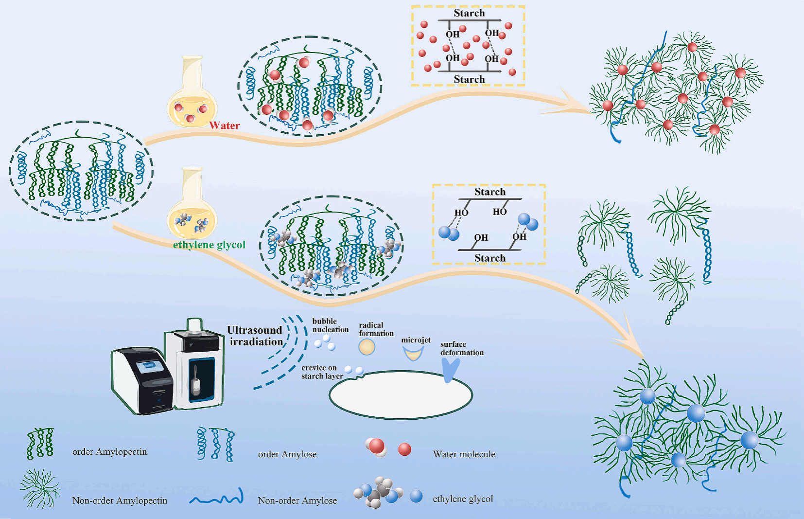 该研究创新性采用乙二醇作为塑化剂,实现了高直链玉米淀粉在234℃高温下的完全糊化,并确定了最佳工艺条件。研究发现乙二醇不仅作为塑化剂,更扮演“氢键竞争者”角色,有效破坏淀粉分子间氢键网络,打开双螺旋结构,促进淀粉从有序晶体向无序结构转变。研究结合差示扫描量热仪、共聚焦激光扫描显微镜、傅里叶变换红外光谱等实验手段与分子动力学模拟,多尺度揭示了相变机制。其研究成果深化了对淀粉塑性化过程的理论认知,为淀粉基材料在高温注塑、流延成型等工业加工提供了可行技术方案,对推动塑料污染治理、实现“双碳”目标具有重要意义。