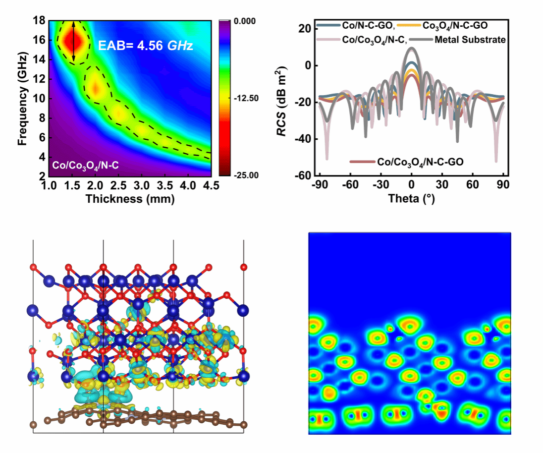 面对电磁辐射的防护需求,开发一种集强吸收、宽带宽和低填充于一体的电磁吸收材料是具有挑战性的。本研究创新性地提出了一种界面电子耦合相转变的策略:即通过钴基磁性异质组分的调控实现磁-介电平衡。丰富的异质相界面存在大量的孔隙结构,有益于有效介电常数的降低,确保入射波的稳定吸收。钴基异相组分之间的磁耦合行为提高了磁损耗对整体损耗的贡献。通过密度泛函理论计算证实,氮掺杂引起的缺陷和电荷重新分布打破了局域电子密度对称性,揭示了电子转移对于极化损耗的作用。结合电磁仿真结果表明,所研制吸收剂在3.14 mm厚度时可实现-61.59 dB的反射损耗以及最大4.56 GHz的有效吸收带宽。上述结果可为新一代抗电磁干扰吸收剂的开发提供新思路。