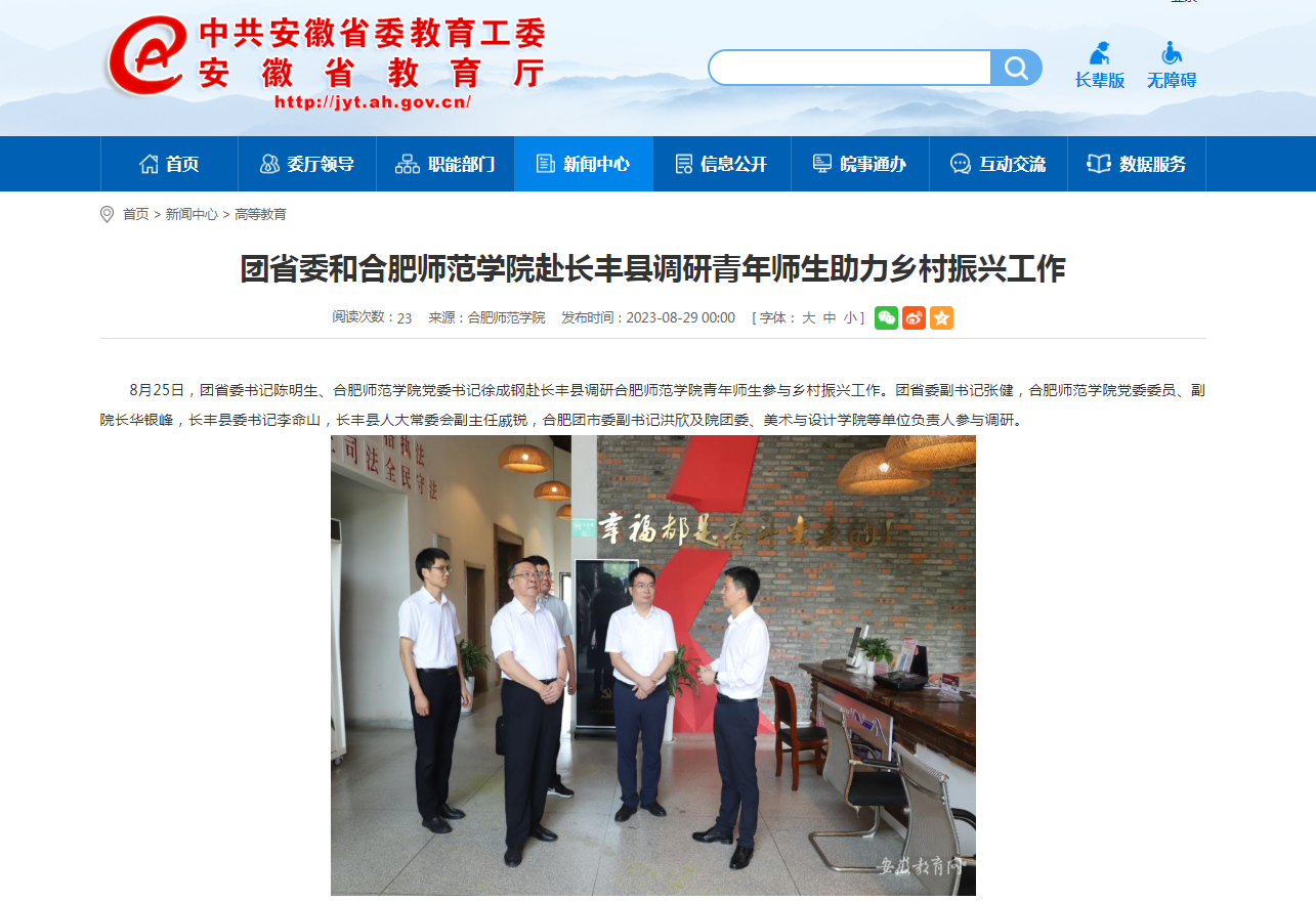 8月29日,安徽教育网以《团省委和beat365唯一官方网站赴长丰县调研青年师生助力乡村振兴工作》为标题,对此进行了报道。