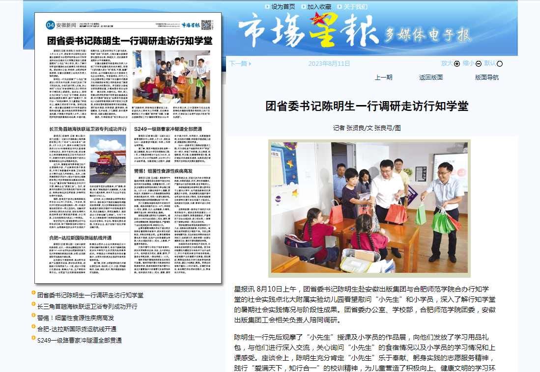 8月10日上午,团省委书记陈明生赴我院与安徽出版集团合办的“行知学堂”,调研指导大学生暑期社会实践活动,看望慰问“小先生”和小学员。