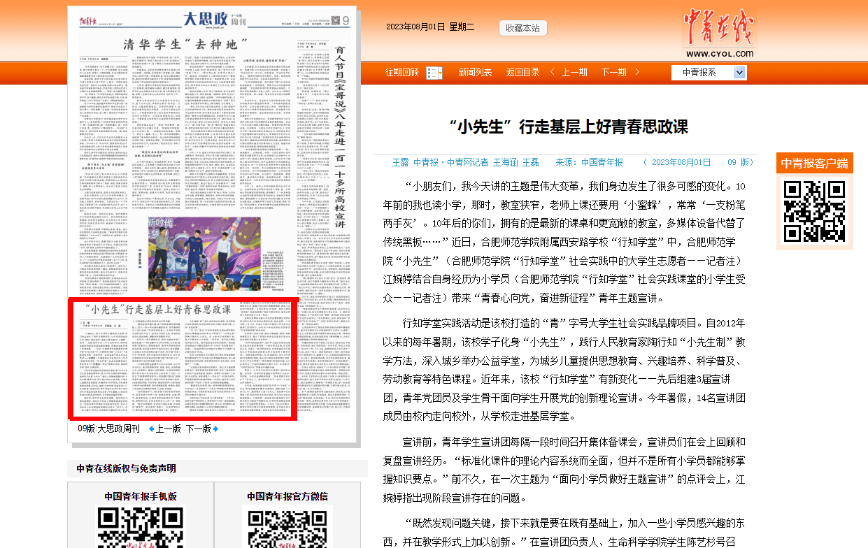 8月1日,中国青年报在第9版以“‘小先生’行走基层上好青春思政课”为题对此进行了报道,这也是中国青年报连续第五年报道我院“行知学堂”实践活动。(院团委)
