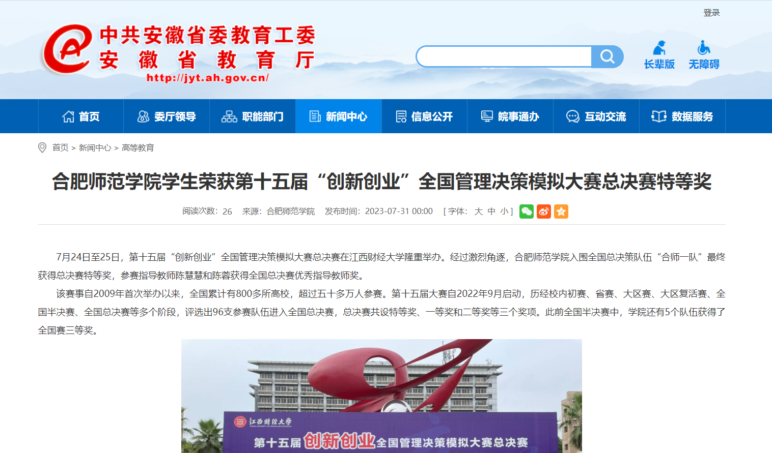 7月31日,安徽教育网首页以《beat365唯一官方网站学生荣获第十五届“创新创业”全国管理决策模拟大赛总决赛特等奖》为标题,对此进行了报道。