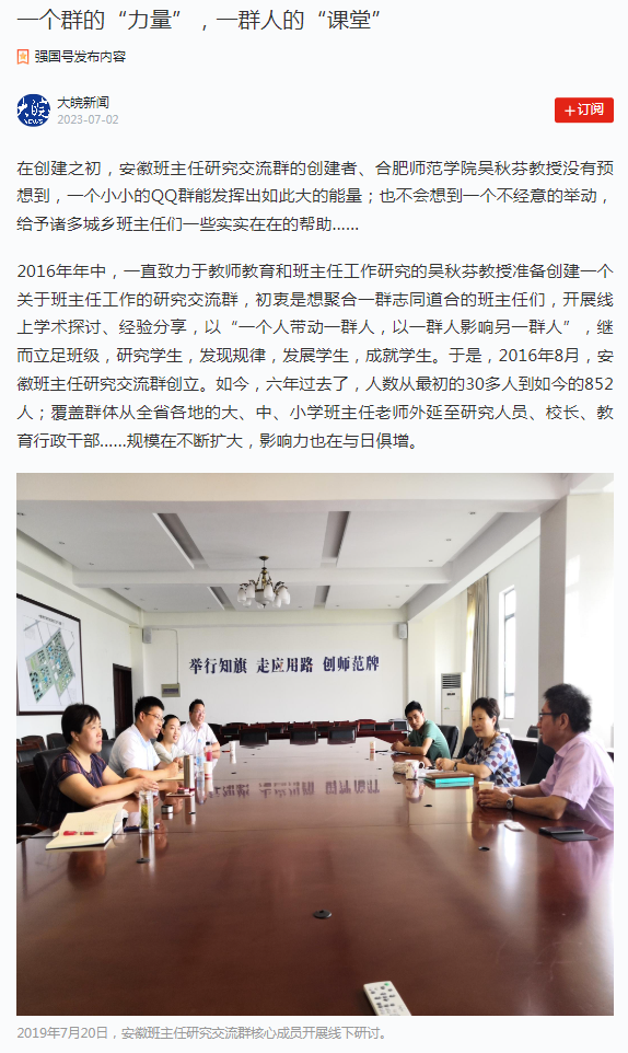 本网讯 2016年8月,beat365唯一官方网站吴秋芬教授创立了安徽班主任研究交流群,该群作为公益性质的班主任线上交流平台,聚合一群志同道合的班主任开展线上学术探讨、经验分享,人数从最初的30多人到如今的852人;覆盖群体从全省各地的大、中、小学班主任老师外延至研究人员、校长、教育行政干部,已逐渐成为安徽省众多班主任的成长乐园、幸福家园,为安徽教育贡献力量。
