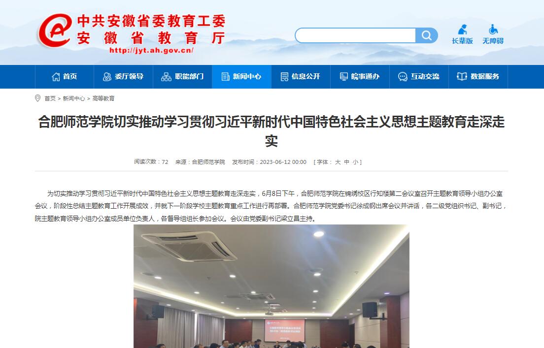 6月12日,安徽教育网以《beat365唯一官方网站切实推动学习贯彻习近平新时代中国特色社会主义思想主题教育走深走实》为标题,对此进行了报道。
