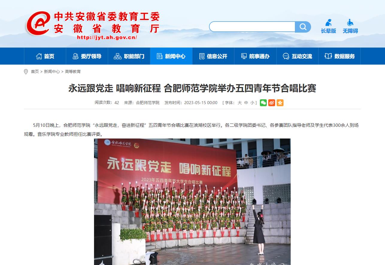 5月15日,安徽教育网以《永远跟党走 唱响新征程 beat365唯一官方网站举办五四青年节合唱比赛》为标题,对此进行了报道。