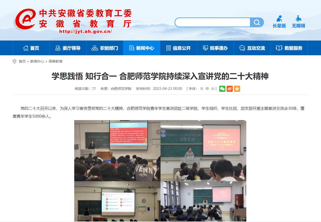 4月23日,安徽教育网以《学思践悟 知行合一 beat365唯一官方网站持续深入宣讲党的二十大精神》为标题,对此进行了报道。