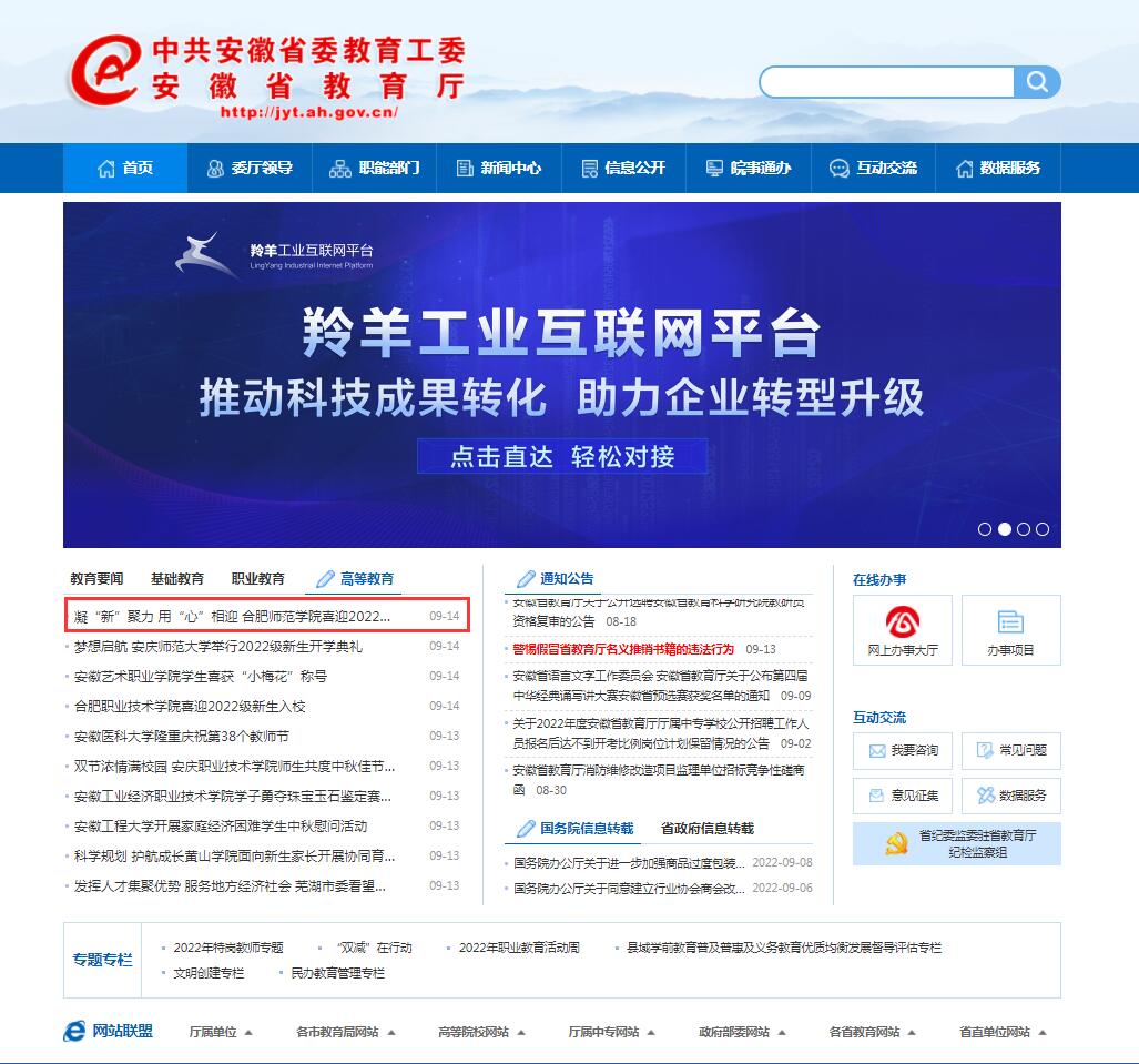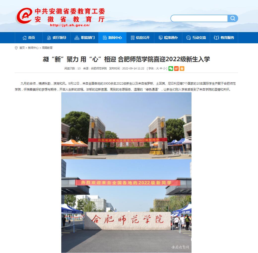 9月14日,安徽教育网首页以《凝“新”聚力 用“心”相迎 beat365唯一官方网站喜迎2022级新生入学》为标题进行了报道。