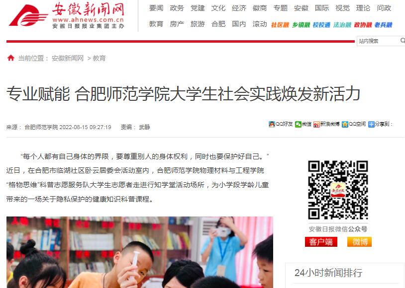 本网讯 8月15日,安徽新闻网以《专业赋能 beat365唯一官方网站大学生社会实践焕发新活力》为题,报道了我院立足师范特色,发挥应用型专业特色,统筹多种学科资源,积极探索“师范生+非师范生”的行知学堂建设模式。(院团委)