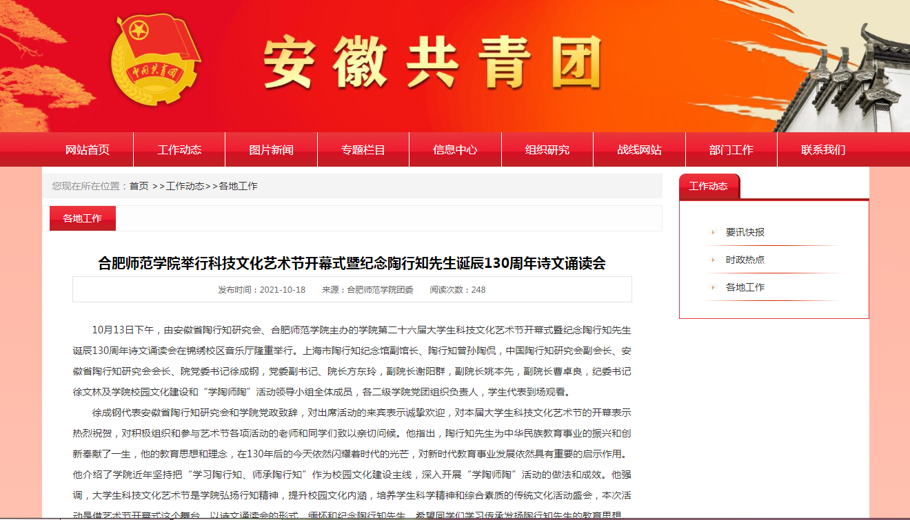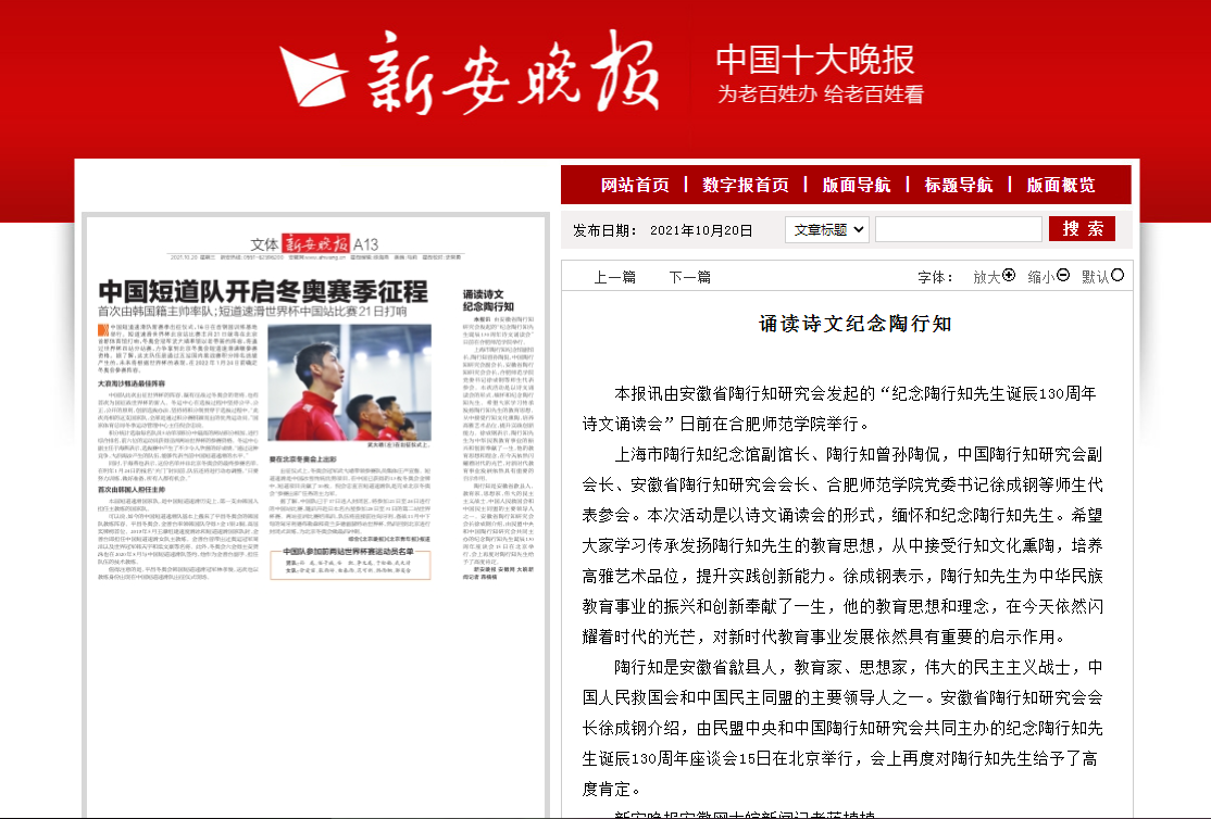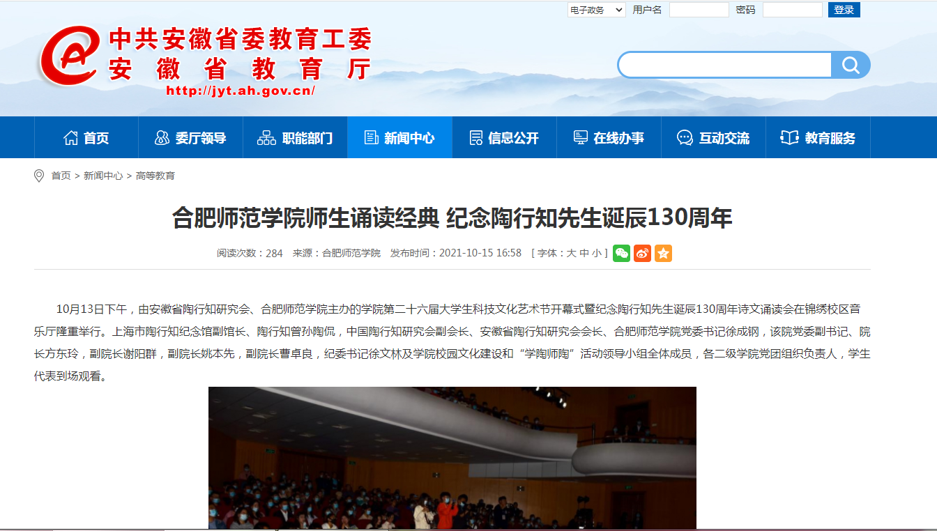 安徽电视台、《新安晚报》等报道我院纪念陶行知先生诞辰130周年诗文诵读会