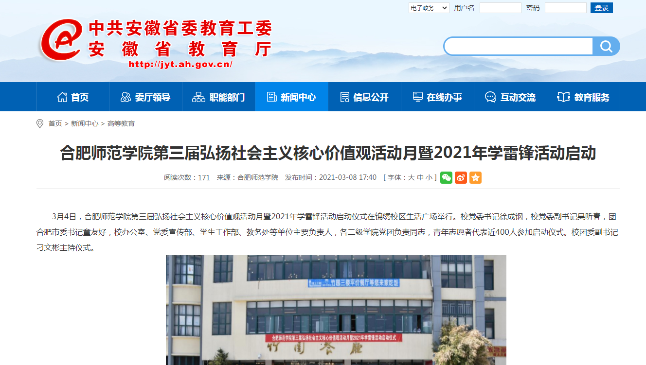 安青网、安徽教育网报道我院启动第三届弘扬社会主义核心价值观活动月暨2021年学雷锋活动