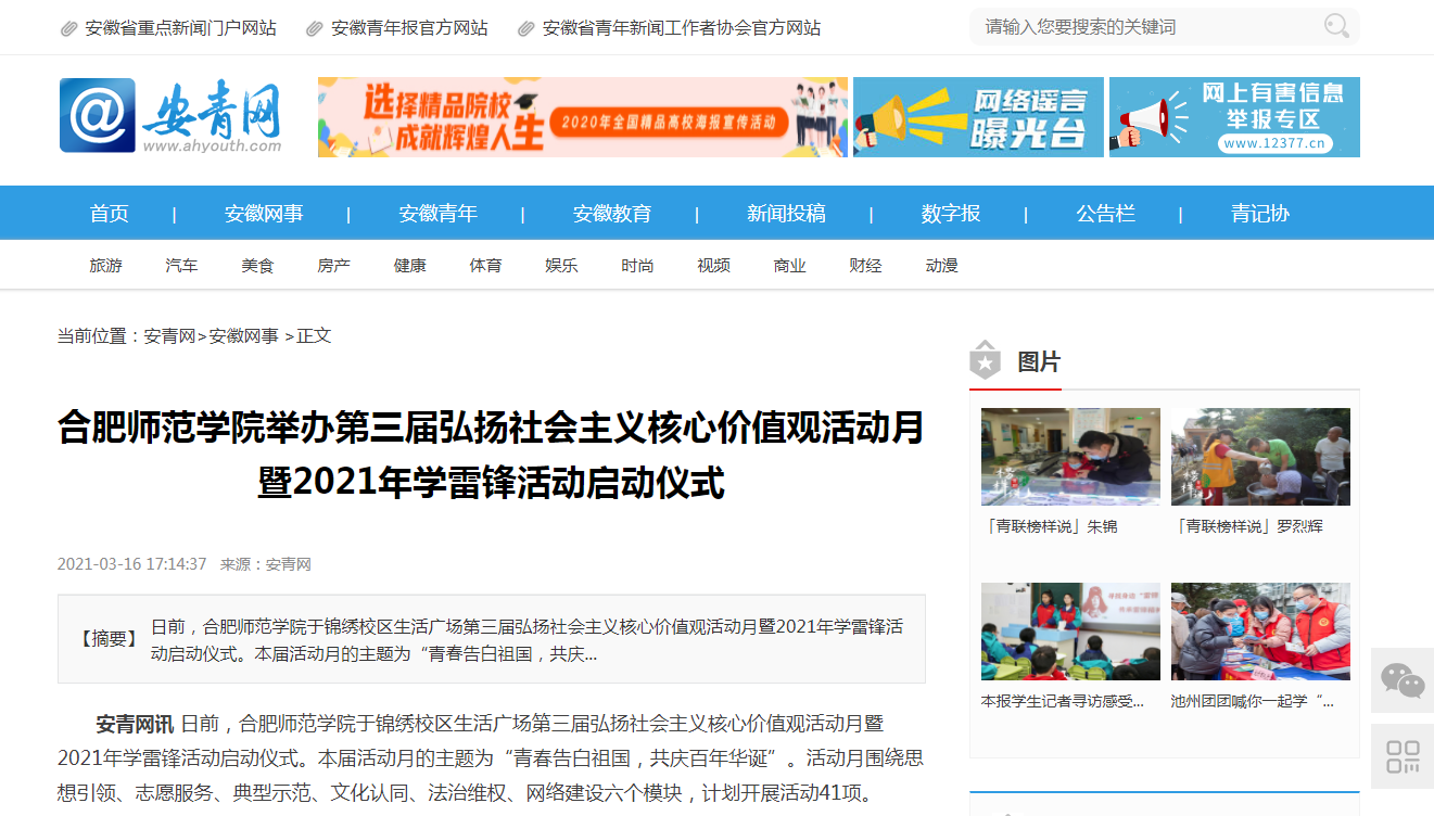 本网讯 近日,安青网、安徽教育网对我校举行第三届弘扬社会主义核心价值观活动月暨2021年学雷锋活动启动仪式进行了报道。(校团委)