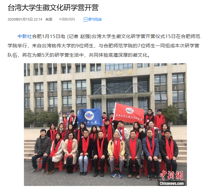 本网讯 1月15日,台湾大学生徽文化研学营开营仪式在我院举行,来自台湾铭传大学的9位师生,与beat365唯一官方网站的7位师生一同组成本次研学营队伍,将在为期5天的研学营生活中,共同体验底蕴深厚的徽文化。